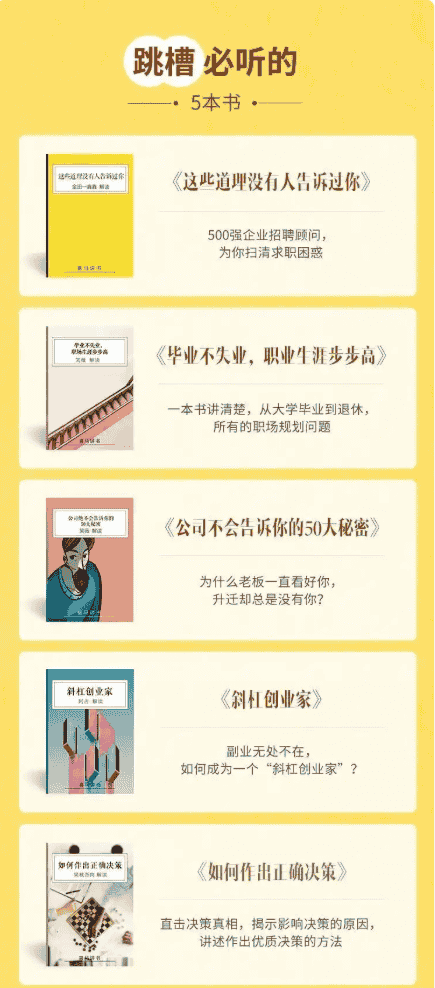 今天主要给大家分享一份职场相关的学习资源“跳槽必听的5本书”。里面的书籍音频我都已经付费下载好了,主要是想和大家分享一些离职跳槽相关的内容。