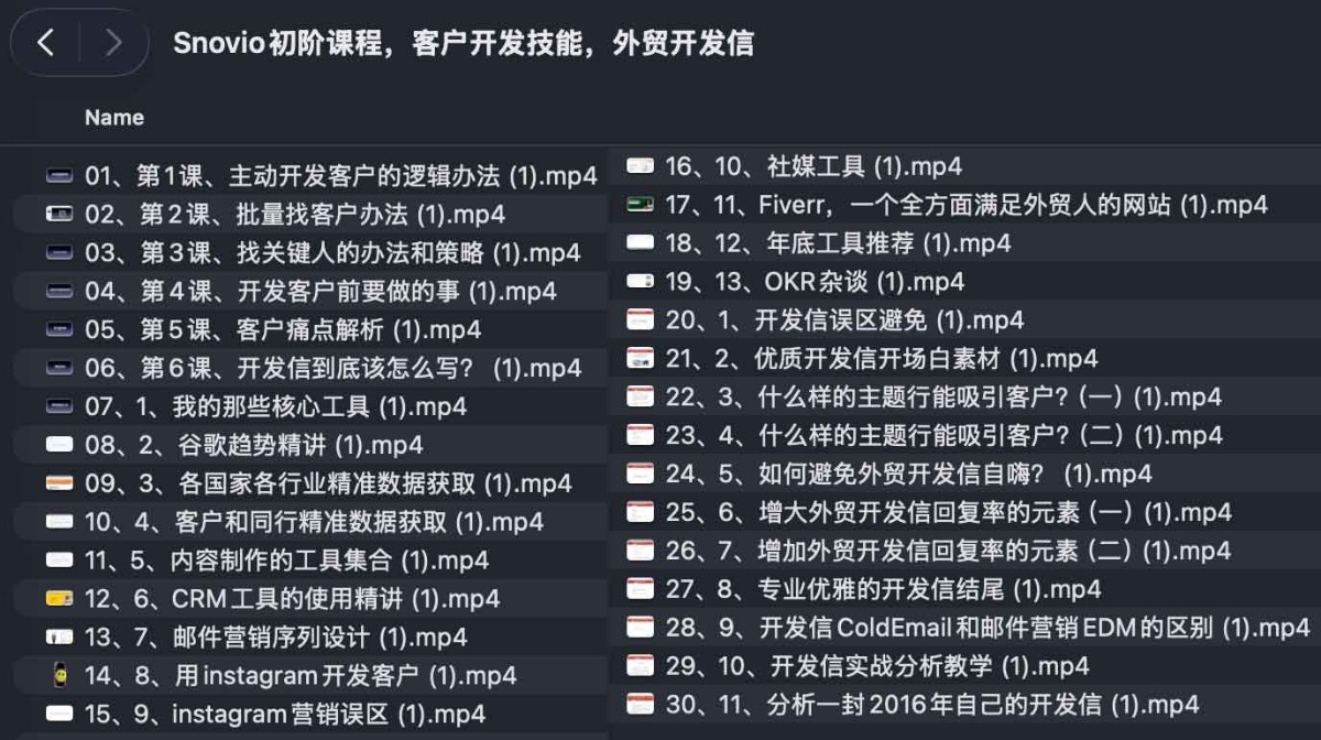 课程以外贸开发信为主线,结合 Snovio 等实用工具,从主动开发逻辑、批量获客方法、关键人识别,到邮件内容设计、社媒引流和数据管理,用一整套实战案例把客户开发这件事变得可理解、可复制、可持续优化。